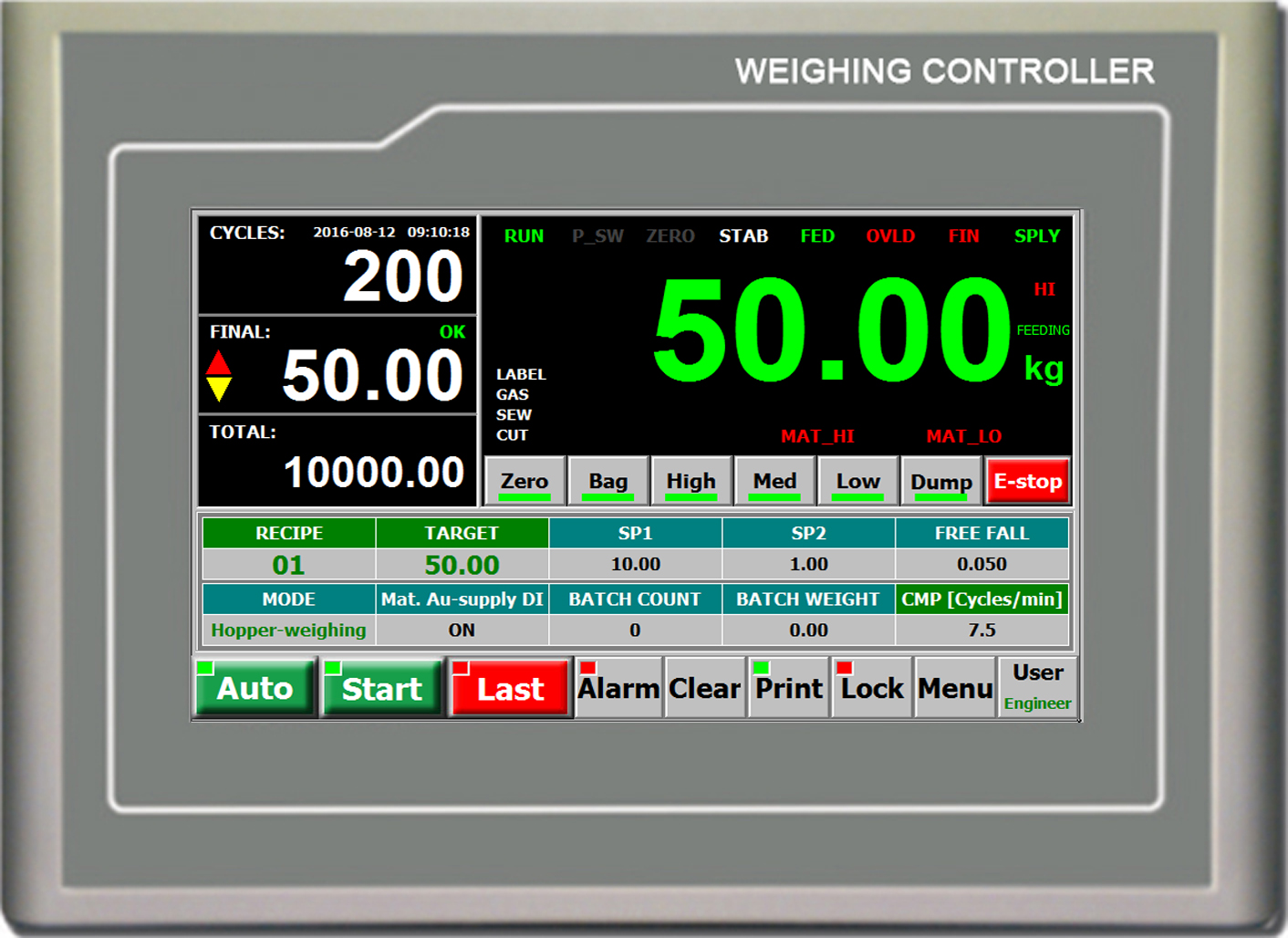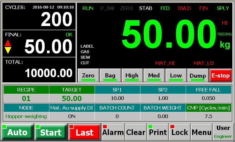 【Clear】 | Clear Screen: Clear the display values of Feeding Weight, Totalized Weight, Batch Count and Cycle Speed. | Engineer Administrator |